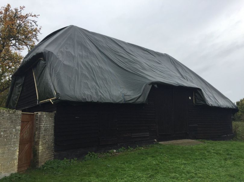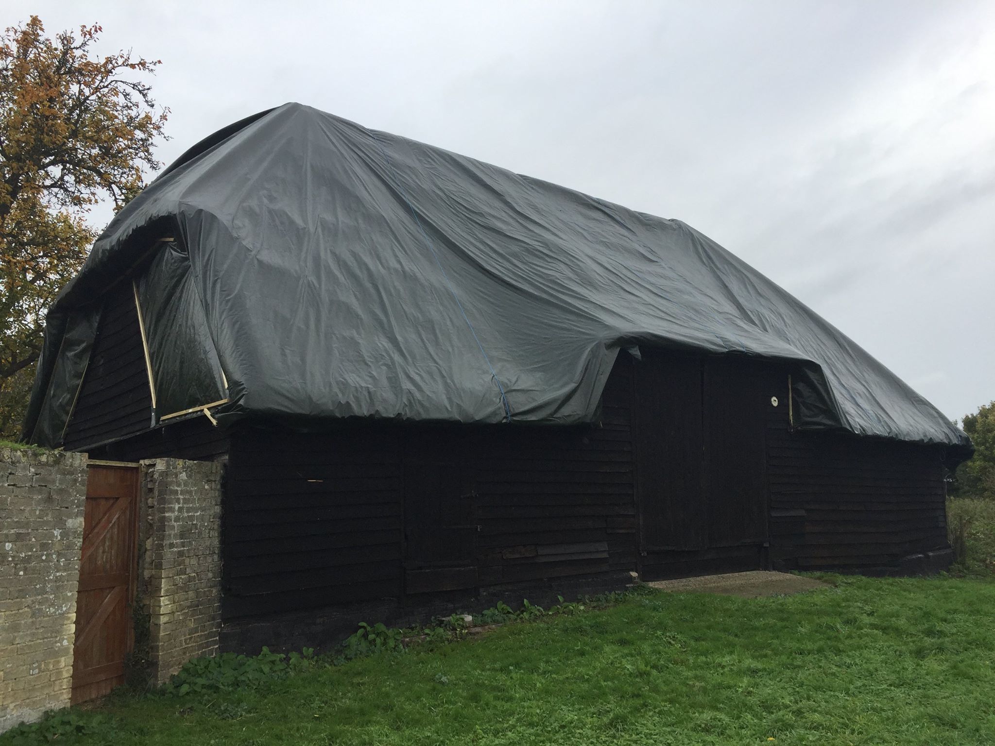 2 thoughts on “Tithe Barn with tarpaulin protecting thatched roof”