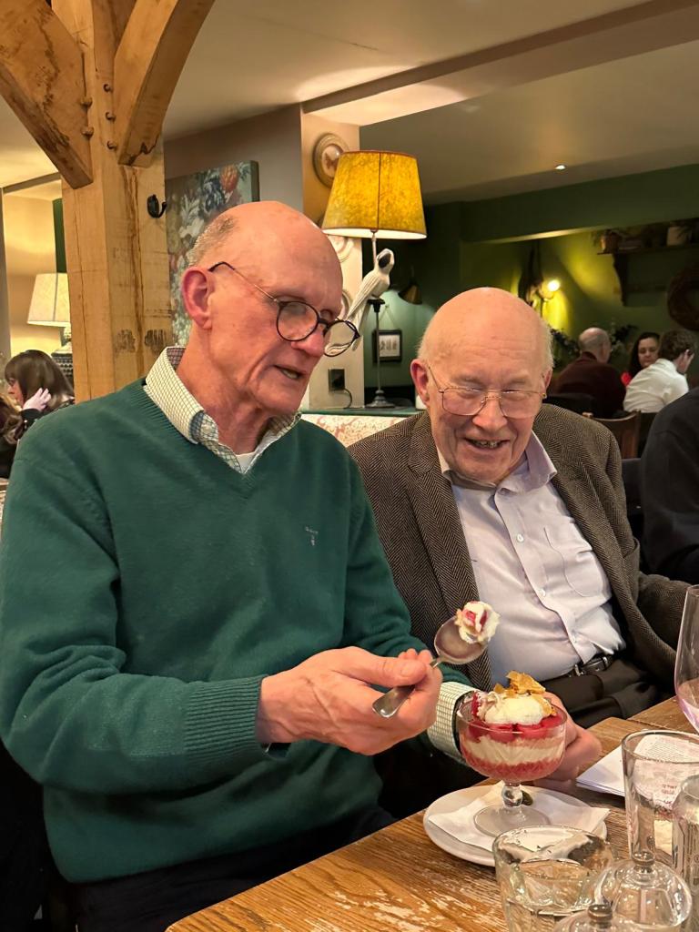 L-R: Explaining the finer points of dessert. Making a point (performing?) at the AGM
