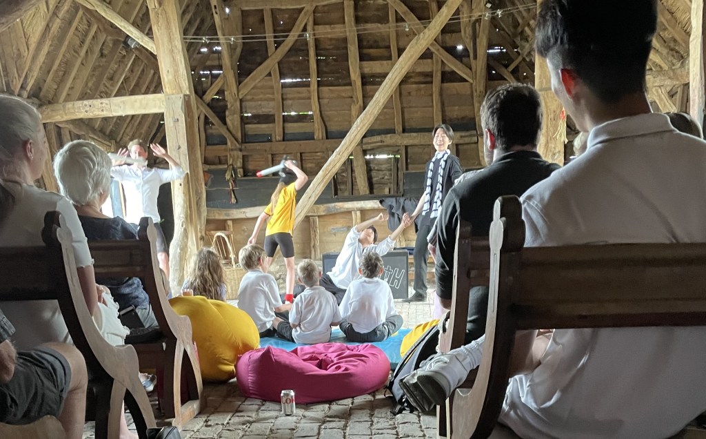 Thursday 16th June finished with what can only be described as a quintessentially perfect English summer evening. It was then that the Tithe Barn Trust hosted in their lovely iconic tithe barn a most exciting and great event in the form of a much edited and reduced play by William Shakespeare. It was enacted by three members of the Cambridge School of Visual and Performing Arts in front of a large and eager audience more than 90 strong which encompassed ages from the very young to the not so young.